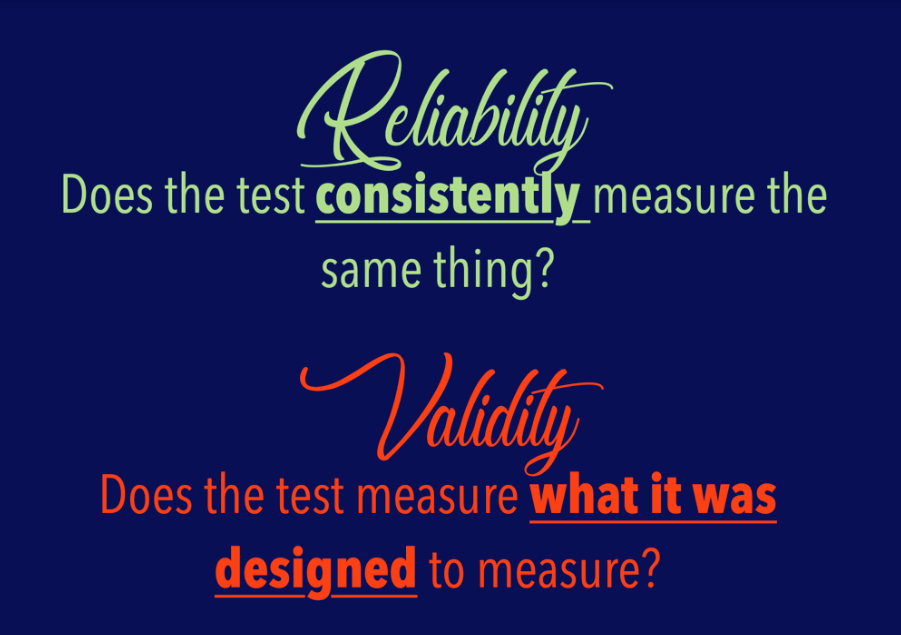 - Internal validity (does the test measure what it says it measures) is more important than external validity (generalizability of results)