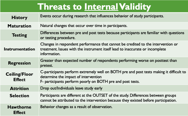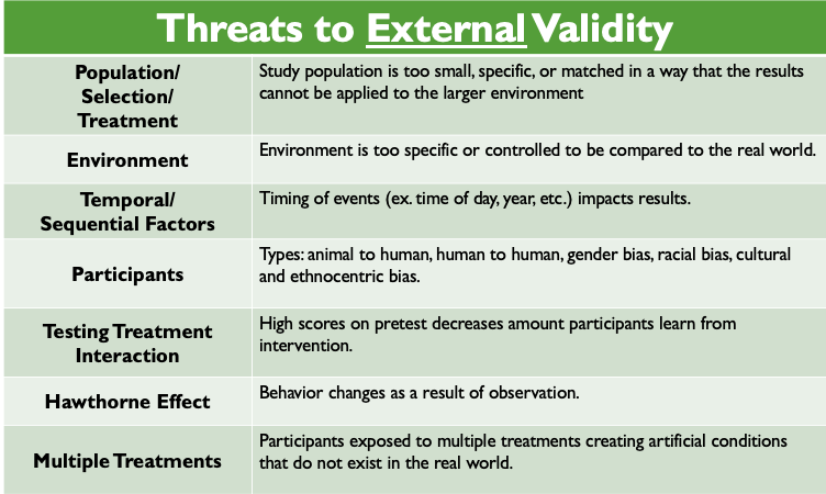 There are 9 threats to internal validity and 7 threats to external validity, notice the crossover between the two.