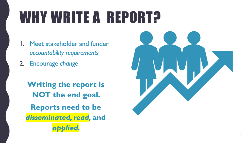 Evaluation reports are an important and often overlooked part of the evaluation process. Evaluation reports are the primary way of communicating findings to stakeholders, funders, and other affected parties.