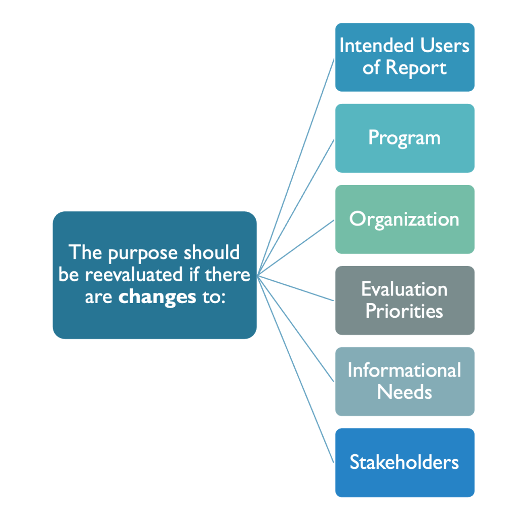 Finally, consider the evaluation purpose throughout the process. You may end up changing or modifying your research purpose at some point during the evaluation process. Adapting the purpose is expected and normal, but you must also adjust the evaluation report to the amended purpose. Your research purpose may require modification if there are changes to elements within the program. Some common reasons for evaluation purpose modification are listed in the graphic below.
