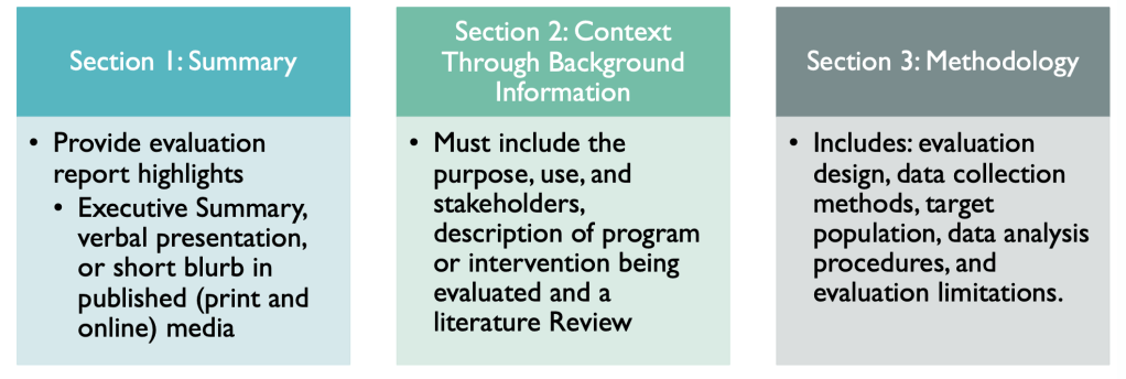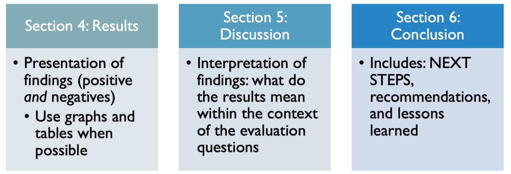 Regardless of the format, the evaluation report should include the following elements: summary, context, methodology, results, discussion and conclusion.